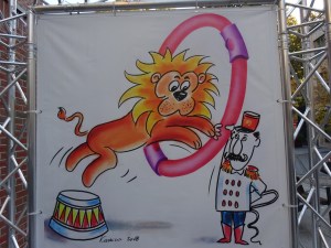 An der Uferpromonade des Baltons stehen Skulpturen, wie hier “ Der Schwimmer“ weiter geht es vorbei an roten Beerenhecken und Rosenbeete.