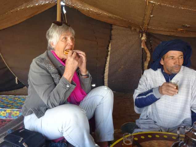 Wir waren zu Gast bei einer Berberfamilie und wurden bewirtet mit Tee und einer großen marokkanischen Pizza ( ein Fladen gefüllt mit Gemüse). Für mich war dies ein Erlebnis was mich sehr bewegt hat. Die Herzlichkeit der Frauen ( zwei Familien) und die Fröhlichkeit der Kinder. Für die Kinder hatten wir als Gastgeschenk Schokolade und Bonbons mitgebracht und Achmed hatte Mandarinen. Die Freude war groß.