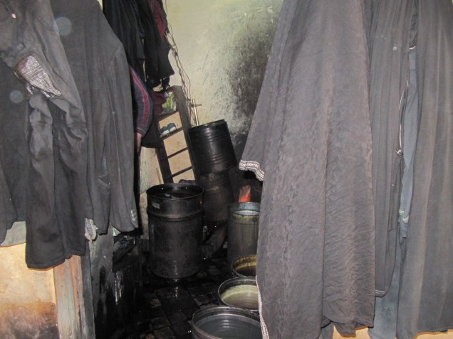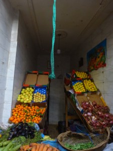 In der Gasse der “ Lebensmittel“ gibt es eine Besonderheit. Weil die Gassen so eng sind haben die Läden keine Türen. Der Verkäufer schwingt sich an einem Seil über die Theke, naja, wenn nicht genug Schwung da ist, landet auch mal  ein Fuß auf dem Fleisch oder was  sonst so da liegt.