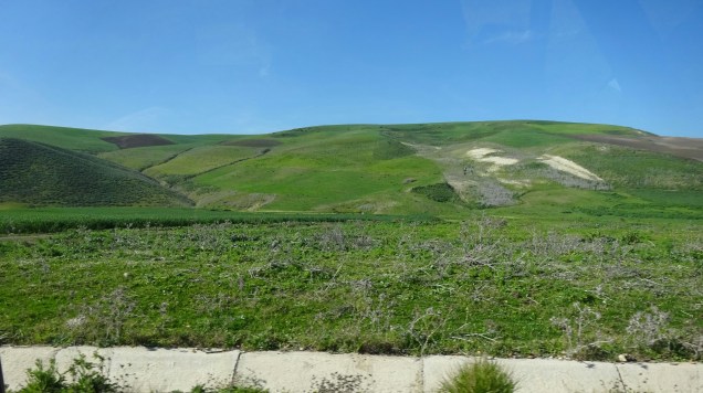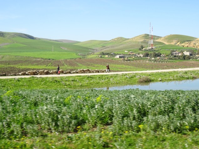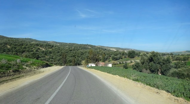 Von Fes nach Sidi Kacem und dann auf die N1, eine gut ausgebaute Straße. Am Anfang war die Strecke etwas öde, später fuhren wir durch eine Landwirtschaftlich geprägte Natur. In hügeliger Landschaft mit weitem Blick auf grüne Felder, blühende Wiesen, Olivenhaine und natürlich durften die Orangenplantagen nicht fehlen. Die Straße wurde wieder kurviger und wir überquerten einen kleinen Pass mit schönen Ausblicken auf die bewaldeten Berge und Täler.